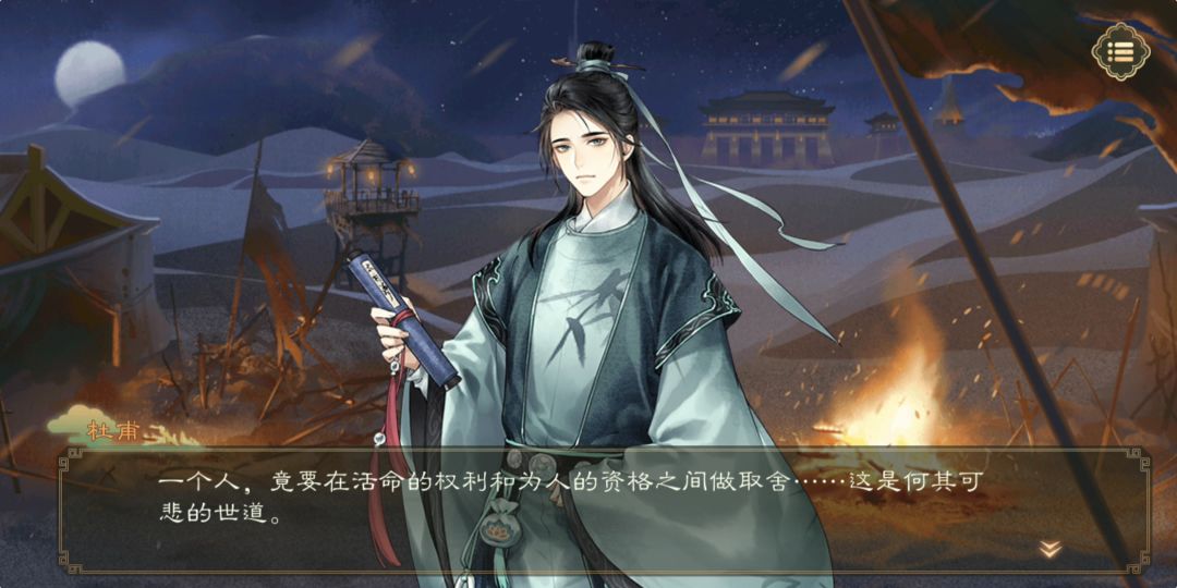 诗选了杜甫的(虽然最喜欢的是李白的诗,李白后来非常潦草的瞄了眼剧情?感觉文本写的有些乙女向,感觉有点怪……异……)可能杜甫相对比较好刻画吧(写实派的事直接描述故事背景,诗又可以很明显勾勒出人物特点)至少我觉得刻画的很成功