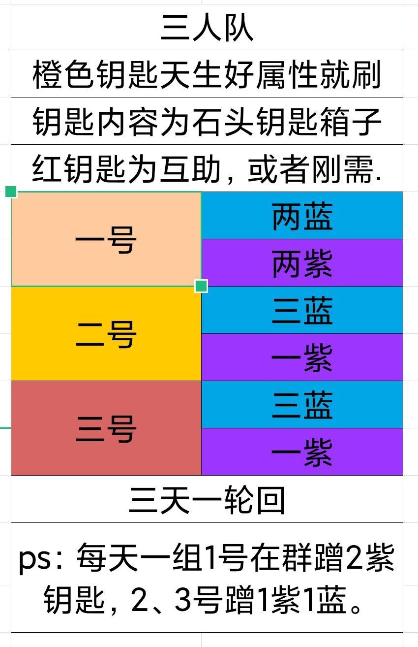 具体是这样的,每3人一组(同公会一组更好),每人每天付出4把钥匙,3把蓝色稀有钥匙,1把紫色史诗钥匙,然后剩下的2把史诗去白嫖(或者有人每天付出2把紫色史诗,2把蓝色稀有,互换着来)