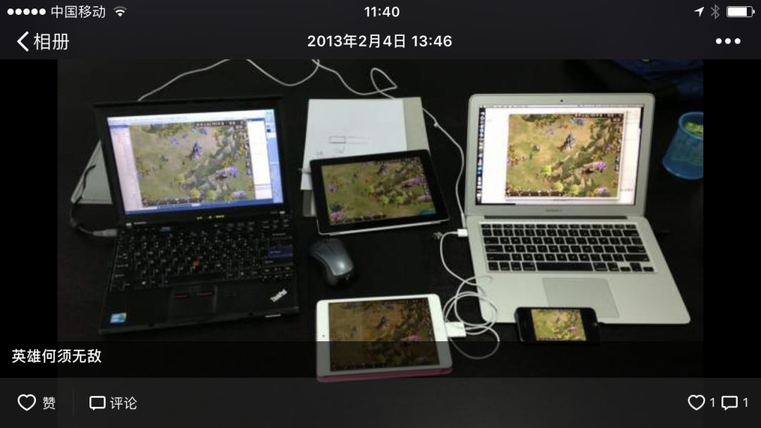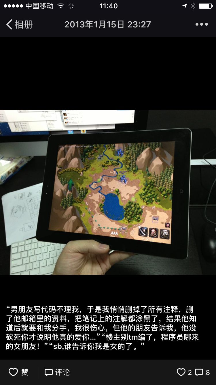 游戏的一个Demo终于出来了, 还处在非常原型的阶段, 我们选用了cocos2d-x来做图形方面的管理, 游戏逻辑则是C++和lua脚本语言来共同实现。图中这台设备是2011年发布的iPad 2代, 从画面上可以看到人物和地图都还是Q版风格的,我们请了一位外包的美术小鹿帮我们绘制了一整张的测试地图, 整图不包含拼接的成分, 然后在上面摆放了3个英雄人物, 可以轮流控制他们行走和寻路, 这个Demo主要作用是呈现游戏最基本的画面感觉, 以及场景与人物之间的融合互动, 当时正好看到一个程序员的笑话, 借用了一下就发了一个朋友圈,在那个微信刚刚普及, 段子还不是很多的年代,感觉还是蛮好笑的。