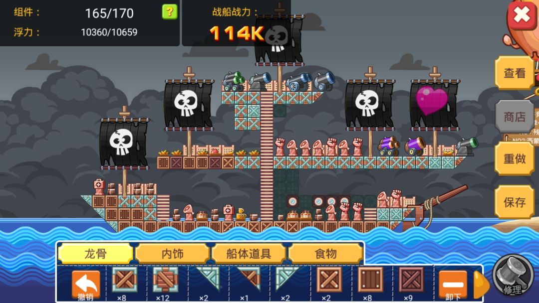 1.组件:主要包括龙骨、内饰、船体道具(炮除外,炮不算组件)。每一样东西算一个组件,即每安装一个,组件数量+1。食物不管怎么摆都不算组件数量。这个数值最重要,战舰升级以后,这个数值上限会增加,决定了你的船能做多大,能有多么丰富的配饰,你的船有没有个性,好不好看。