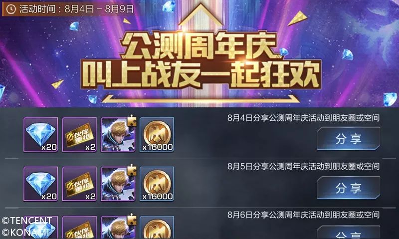 只需分享就有钻石拿!8月9日前,每日分享公测周年庆活动到朋友圈,即可获得钻石、伙伴重组卡、芬奇碎片、金币!公测盛典倒计时,快叫上你的战友们一起狂欢吧!