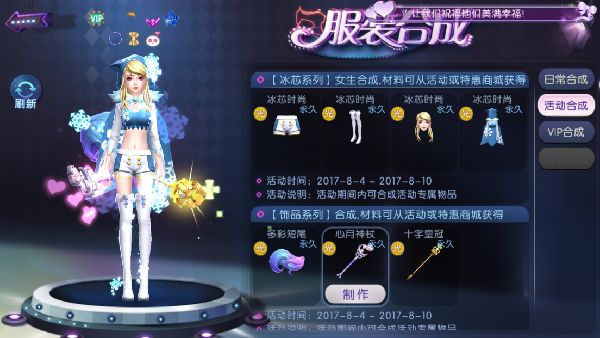 炎炎夏日,穿上一套冰冰凉凉的服饰,解暑又养眼!活动中拿到的KING奖杯,可在服饰工坊中进行服装合成。全新登场的套装中,有梦幻美丽的冰芯系列服饰:清爽的蓝色和白色是衣服的主色调,背心和超短裤配上飘逸的蓝色披风,再在衣服上点缀雪花元素,一套像在童话里走出来的可爱装扮,为穿上它的女生带来加分的魅力。