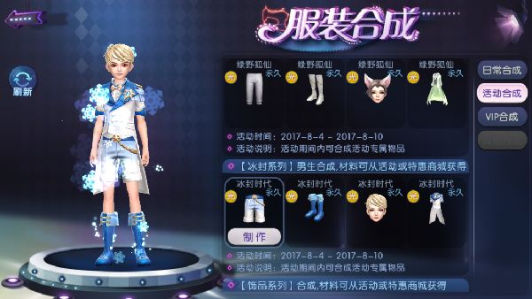 为男生准备的冰封系列套装同样惊喜:休闲的驳领白色燕尾服,配上蓝色的复古短靴,旋转的雪花围绕在服饰周围,为AU男神们打造浪漫绅士的气质,在夏日过目不忘。