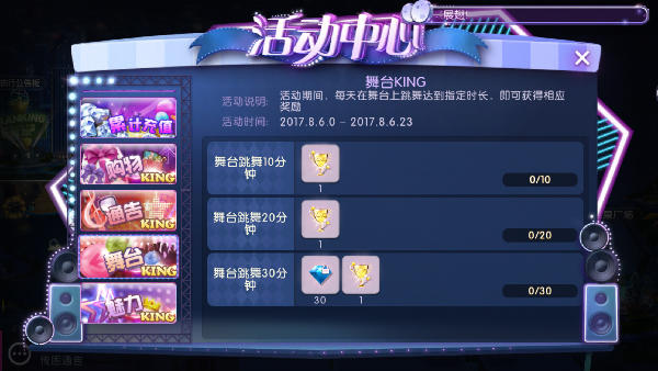 活动包括“购物KING”、“通告KING”、“舞台KING”和“魅力KING”四个部分,不同的KING活动针对不同任务进行奖励,如“舞台KING”用以奖励在舞台上时间较长的AU玩家。快来加入夏季梦幻运动会,完成任务后领取更多惊喜吧!