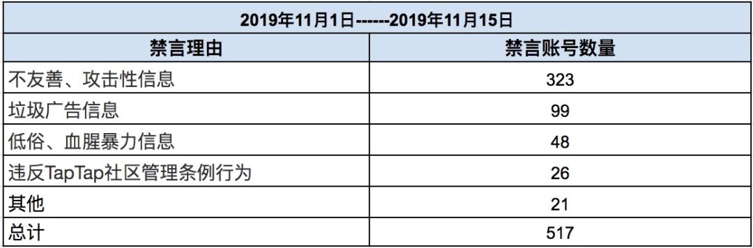 十一月上半月禁言总量517,小幅减少,禁言账号数据主体依旧是那些发布不友善内容的用户,小管家依旧希望各位Taper在交流时能文明措辞,友好交流。