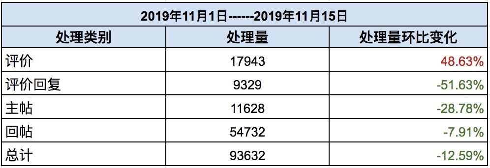 十一月上半月内容处理量为93632条,平均每日处理内容6242.13条,本期内容处理量小幅下跌,值得注意的是,由于近期对水军活动的集中处理,导致评价处理量环比增长明显。