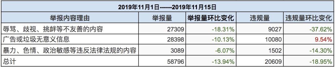 十一月前两周社区总举报量为58796条,同比减少13.94%;实际处理量20609条,同比减少18.95%,举报核实处理率35.05%。本期除广告类实际处理量外其余数据均小幅下减,小管家希望各位Taper发布宣群交友类内容时还是要发对相应位置哦~
