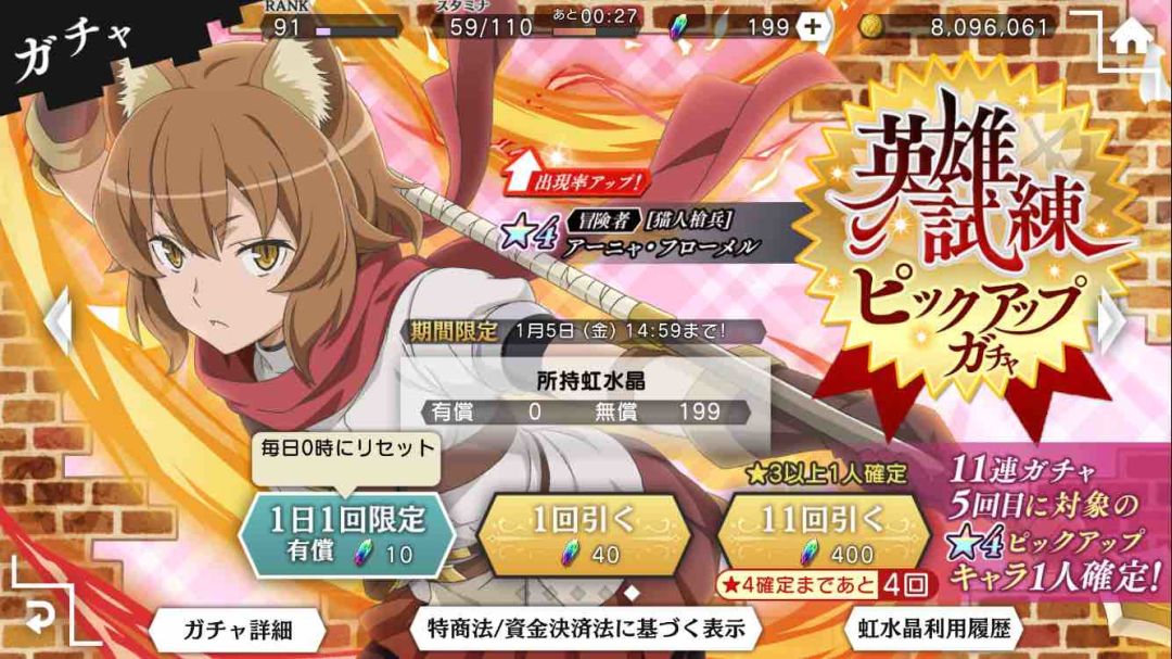 然后要讲的就是抽卡的有效选择了。如果遇到一个三角色卡池有自己想要的卡的话在活动期间内抽够10回是最理想的状况,一个高破乃至满破的角色在各个方面是受益无穷的,而且时不时会有送彩虹石的活动(用来突破角色用)。如果凑不够10回的话就第1回之后每够1200水晶抽3回就是了,保证4星的稳定出货是最重要的。