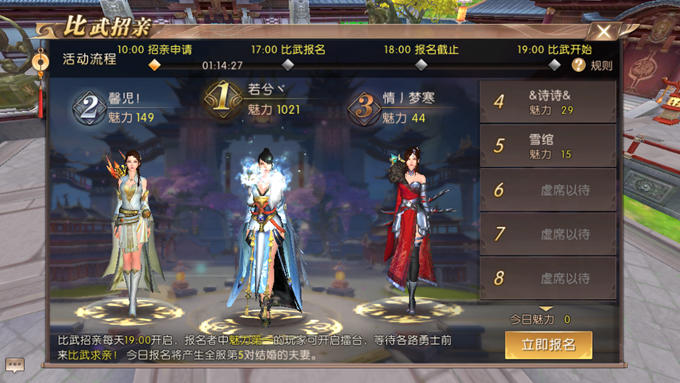 多元社交 让感情变得更深刻比武招亲的具体玩法,需要女方使用道具——玫瑰,前往轩辕城的红娘处报名。每日魅力第一的玩家可开启擂台,等待有缘者前来迎娶自己。想要抱得美人归的男玩家也需要使用道具玫瑰提前报名,名列前十的天命者才有资格打擂,为红颜而战。与传统游戏内的婚姻社交玩法不同,除了两名玩家之间的两情相悦,更需要双方共同努力,方能终成眷属。比武招亲,在基础的社交内容上设置了更多可深挖的社交元素,增进情侣间的了解,加大对于感情的投入,自然而然的让来之不易的情感更加深刻。