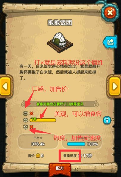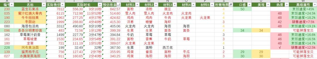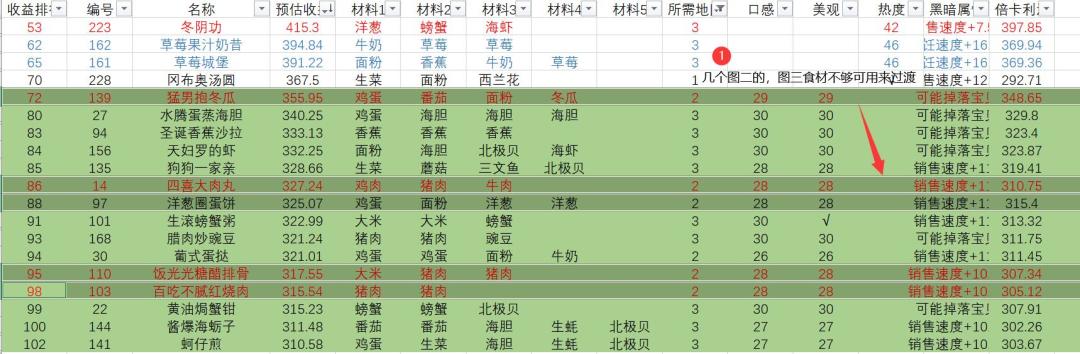 估计萌新也没多少【佐料】来【回炉】(可以增加料理属性,如口感),前期的菜,尤其图一图二也没啥回炉的必要,所以这是按原始【口感】来的;(口感菜就是料理有口感属性(嘴的图标)的菜,在下面连接指引的收益排行里可以看到)