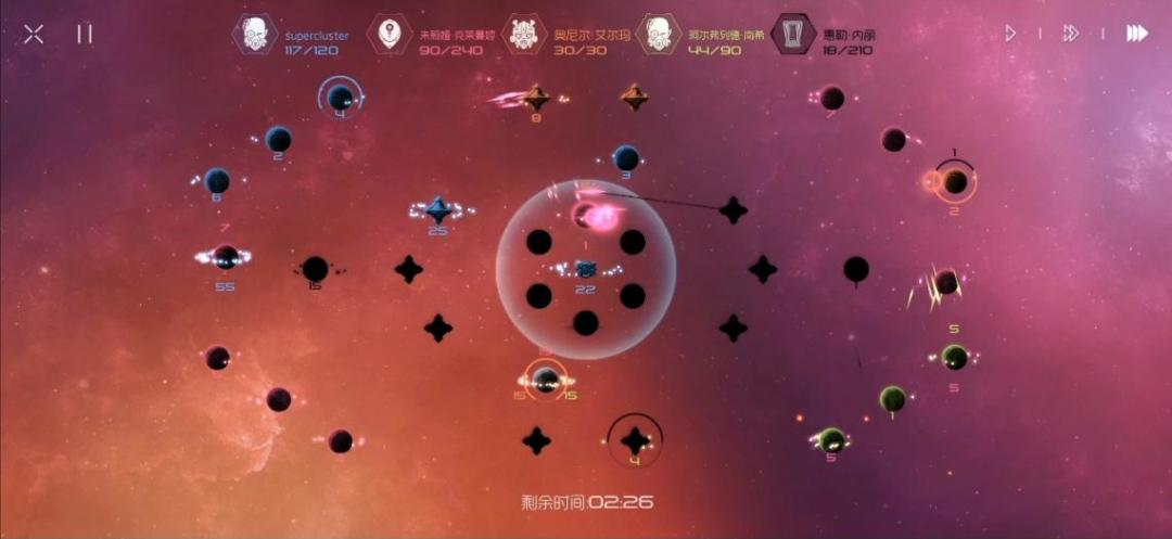 接下来说一说玩家该做的。开局分40%左右的飞船去绿色星球,等蓝色星球出了障碍后剩下全军去上半地图右边的航母。与此同时,之前到达绿色星球的舰队再出动去下半地图的航母。期间会有部分飞船被射线炮摧毁,把蓝色星球生产出的飞船各派2个去上、下的AI没占的捕获,其它生产的飞船派去帮助占领航母。