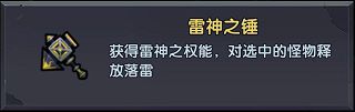 作为雷神使用过的武器,这个锤子中蕴含着巨大的能量,当你使用这个道具后,主角会获得超越赛亚人的能量(哈哈,似乎串台了),同时在攻击敌人的时候也会造成雷电天降的效果