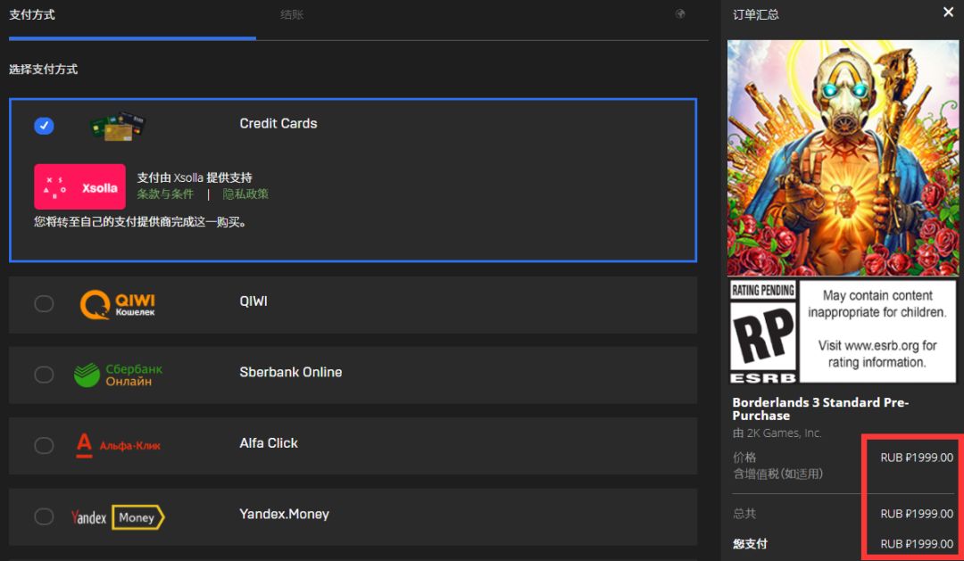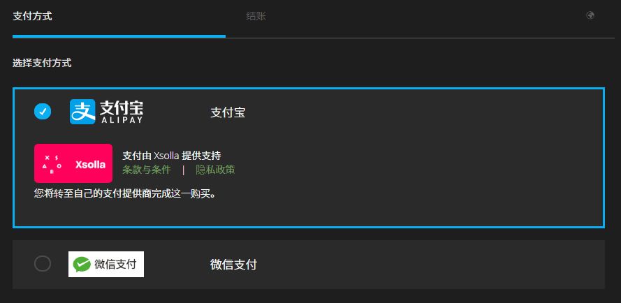 接下来是测试支付功能。在支付页面,国区用户可选支付宝/微信支付作为支付方式——也只能选择支付宝/微信支付,商城不支持国区用户使用最基础的信用卡结算 ,这不免让人感到有一点点奇怪。
