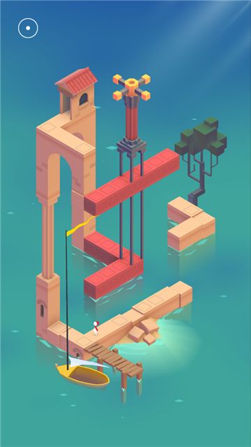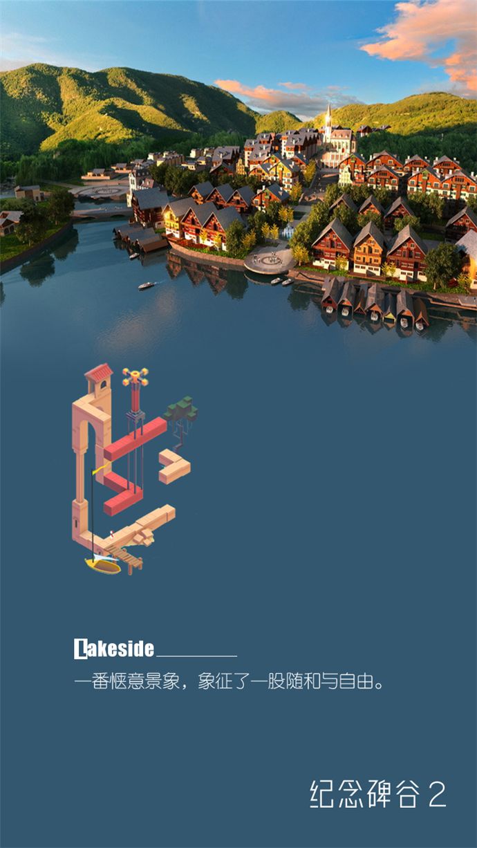 绸缎般的蓝天,蓝宝石般的湖水,在湖中泛起一只小舟,荡漾在天地间。天与湖的蓝配合秋天的金黄,无比惬意美好,象征了一种无拘无束的洒脱。《纪念碑谷2》中场景,同样是蓝天碧水,女儿泛着小舟来到水中的小城,同样是一番惬意景象,象征了一股随和与自由。