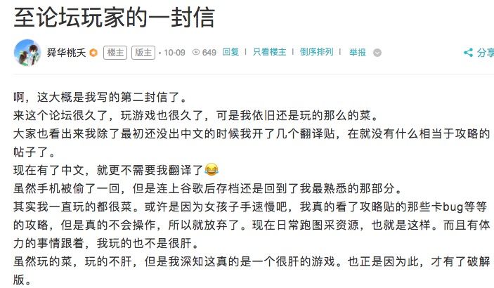 在这款游戏上架并且还没有更新中文的时候,是他们将英文界面翻译成中文,做出图解;是他们写了许多新手攻略和问答帖;在没有开发者的情况下,也是他们积极联系开发者,把游戏的最新动态、更新日志从英文翻译成中文,并将这些内容传达给论坛的每个玩家。