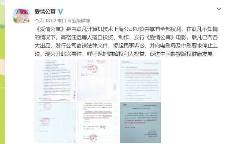 就在昨天,离电影上映不到一周的时间。网络上曝出一则“惊天猛料”。8月6日下午,微博ID“爱情公寓”发博称,编剧汪远在《爱情公寓》的投资方联凡计算机技术公司不知情的情况下,擅自投资、制作、发行《爱情公寓》电影,已提请民事诉讼,并向电影局及中影要求停止上映。
