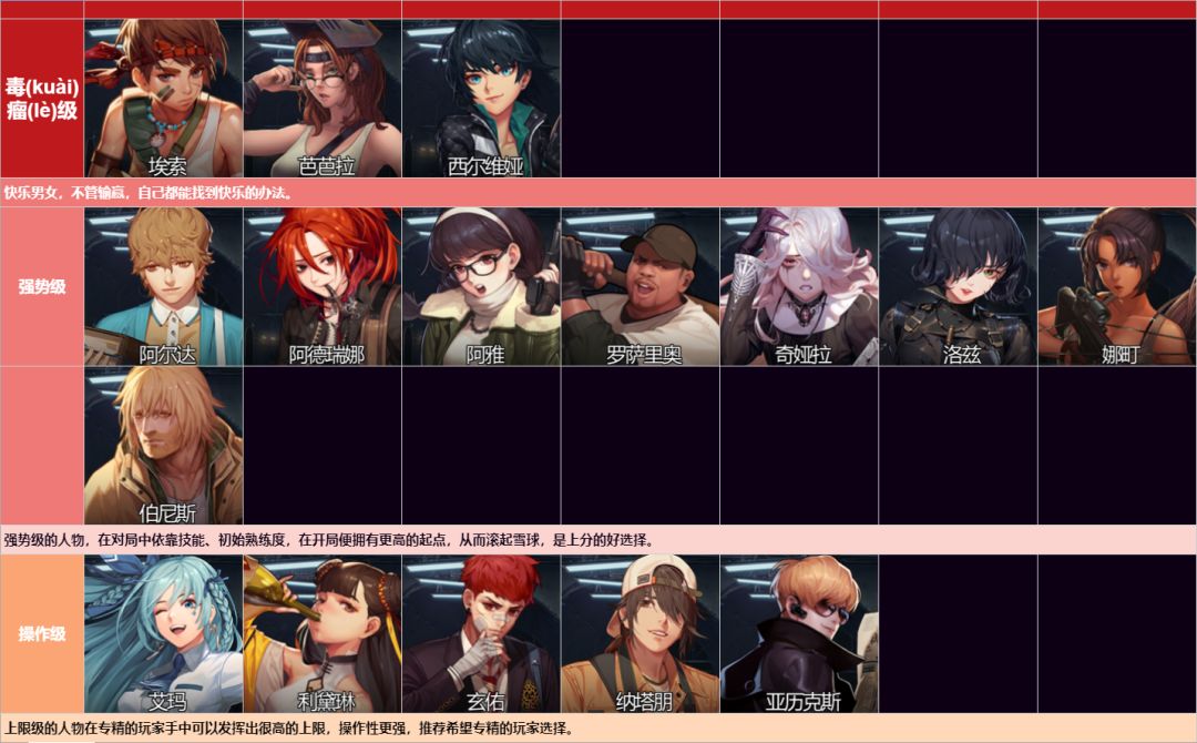 阿雅:阿雅有着游戏中最简单粗暴的高爆发必中技能二连射,同时有着一个不错的副技能,既能回血,又能对抗debuff手。开局对抗其他枪系基本都有一战之力,不过吃亏在D初始熟练,整体机能还是很强,推荐喜欢简单粗暴的枪系学习者。