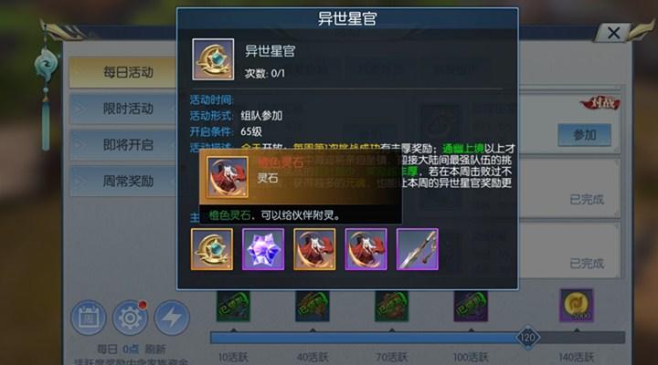 玩家等级达到65级的时候可以组队进行挑战,异世星官全天开放,因为活动难度太高,所以只有境界至少达到通幽上境的才可以参加,而且每周只有第一次挑战成功的时候有丰厚的奖励,异界星官中海迪将亲自坐镇,迎接大陆中最强队伍的挑战,在本周击败过不同的星魂残识、分身、本体,可以获得不同的元魂,拥有的的元魂越多,本周击败星官所获得的奖励就越好,元魂会在每周日24点的时候清零。