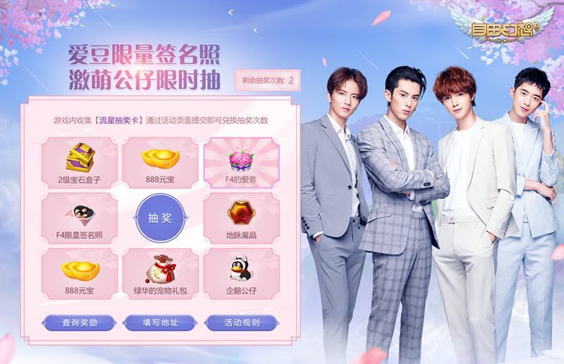 使用流星抽奖券可参与签名照限时抽活动,有机会抽取到F4真人签名照哦~还有激萌企鹅公仔等周边奖励!