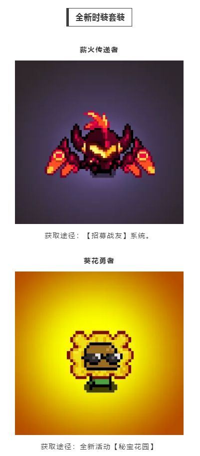 本次更新我们将开启全新的活动——秘宝花园,勇者们在花园中浇树就能获得奖励。全新传说、史诗技能也将加入本次更新,同时还新增了全新时装、头像框、专属头像等新内容。另外,我们还对一些功能系统进行了优化,修正了一些错误,更新维护完成后,勇者们可以前往邮箱领取维护福利。