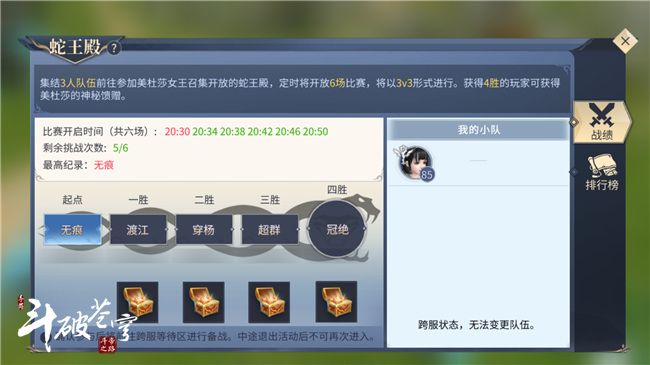 除此之外,《斗破苍穹手游》中还开启了一种3V3的PK模式——蛇王殿。可以1个人参加也可以3人组队参加,进入后会随机匹配队友,也有可能匹配不到队友。若是单人进入没匹配到队友的话可能要1V2或者1V3,对自己实力有充分自信的玩家可以尝试单人进入,体验一下1V3的快感。