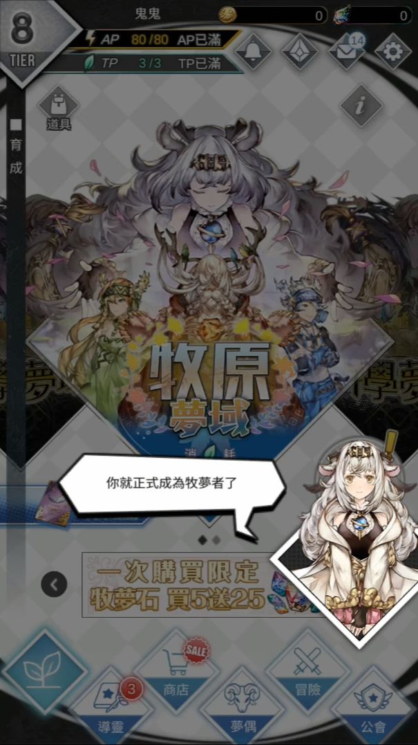 获得导灵(抽取/关卡箱子/任务/签到/活动)→使用5个导灵编成导灵队伍→消耗TP选择梦域→创建梦偶展开对应梦域的故事→完成整个故事作成梦偶→使用4个梦偶变成梦偶队伍→可以单人或者多人协力使用梦偶队伍挑战其他玩家的牧原(梦偶队伍)。