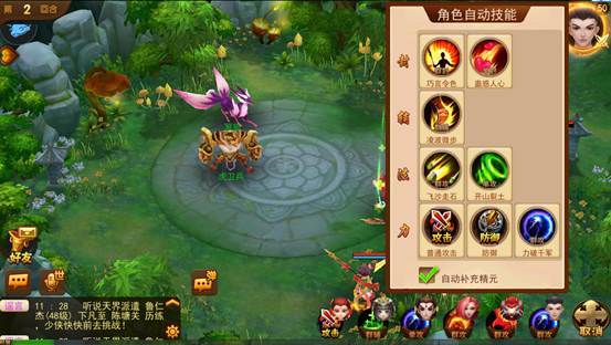 在战斗中点击战斗指令界面中的“自动”按钮,即可开启自动战斗,自动战斗以上一回合的操作为准,持续回合不限,点击游戏主界面的“取消”按钮可以手动取消自动战斗。