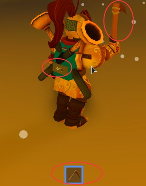 首先我们点击屏幕下方的木镐,就可以把它装备到手上,背包上也会展示目前你挖到的矿石数量,现在它是0,我们要开始挖矿啦!