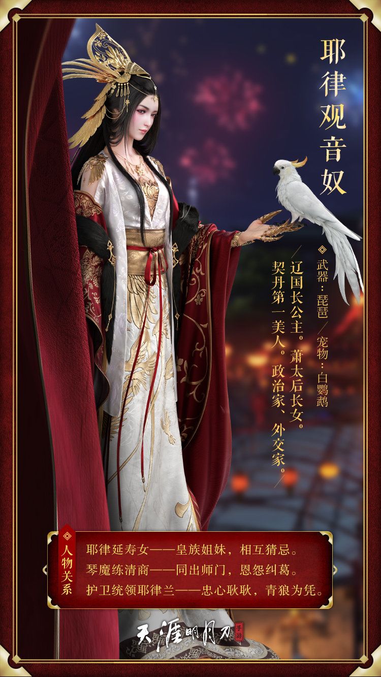 耶律观音奴外表娇嗔妩媚,风流多情,有契丹第一美人之称。但此女城府极深,有着一统天下的志愿,拥有着不择手段的行事方式,以及智谋武功兼备的政治才华。