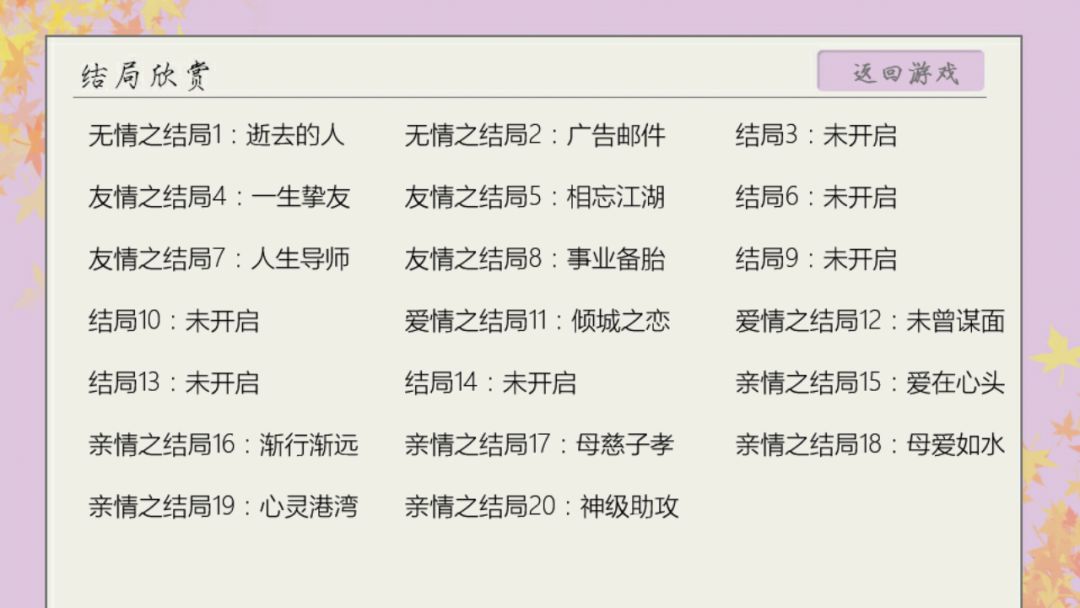 一共打出了15个结局,还有一个旧友重逢没有截图。