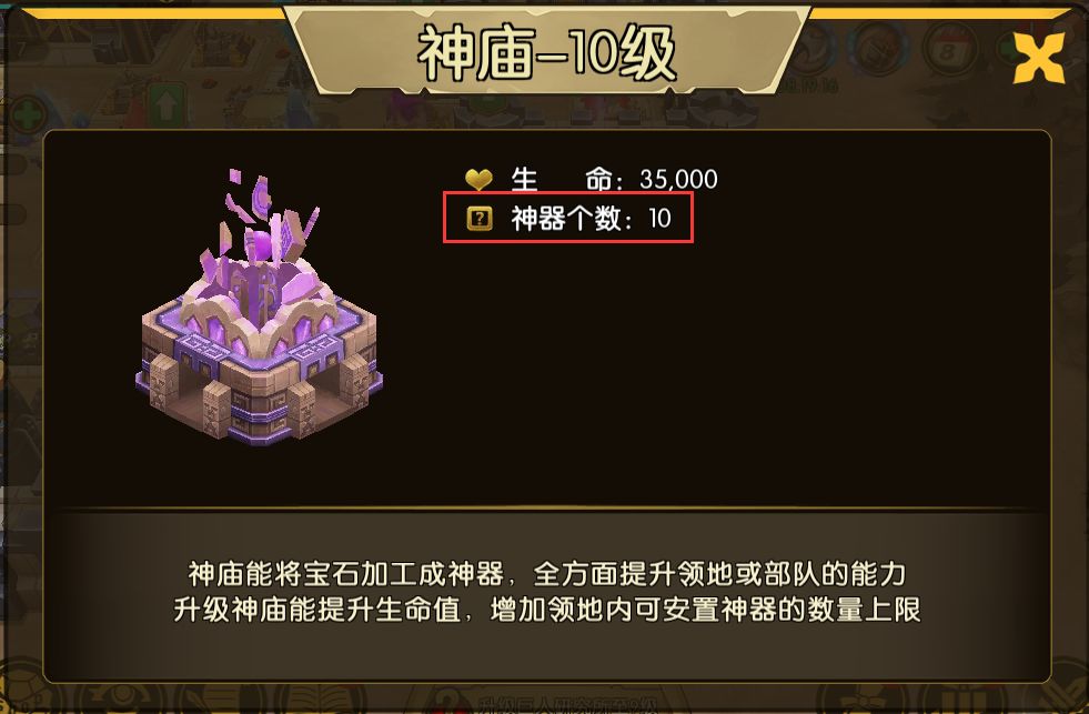 铸造的神器可以摆放在主城内,提升属性。提升[神庙]等级可以提升主城内可以摆放神器的数量(如下图所示表示为神器可以摆放的数量)。