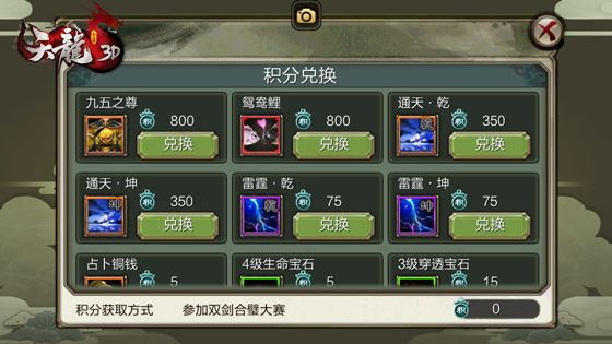 不仅第一奖励丰厚,只要参与福利就不会少。玩家报名参加双剑合璧大赛后将会获得积分,积分可以在商城中兑换潜质102的红色伙伴,橙色、紫色卦象和4级生命、3级穿透、3级韧性宝石,帮助你提升战力下一局再战巅峰!