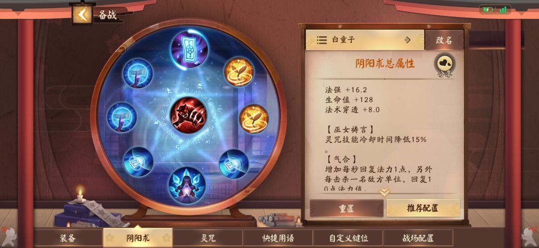 气合必带,缓解线上缺蓝,这里游戏里默认几个全是不带气合的,最好调整下。豹子用来配合线上消耗打爆发。这里带生命值是为了能和对面中单多换几下二技能的触发。巫女是为了能够更频繁使用灵咒。具体属性:法强+16.2 生命值+128 法术穿透+8.0灵咒推荐