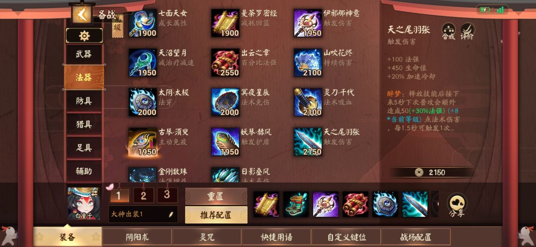 这次就不细致分析所有装备了。【曼荼罗密经】必出,线上特别缺蓝,即使出了也只能一定程度上缓解,前期提供的冷却缩减十分有用。【冷却鞋】提供加速缩减和加快灵咒的使用频率。【天之尾羽帐】个人觉得日影叠风的效果不如天之羽来的明显。白童子单杀对面基本上是靠的一三技能的消耗接二技能位移配合普攻达到触发特质。伤害着实很爆炸,大多数情况可以直接秒脆皮。这点深有感触,把把都有白童子,已经被秒不下多次。天之尾羽帐的被动也可以一定程度上对普通提高一定的增益效果。嘤嘤术: