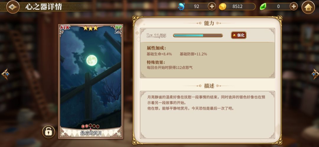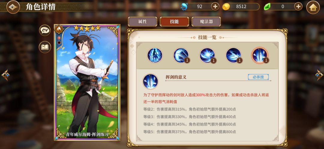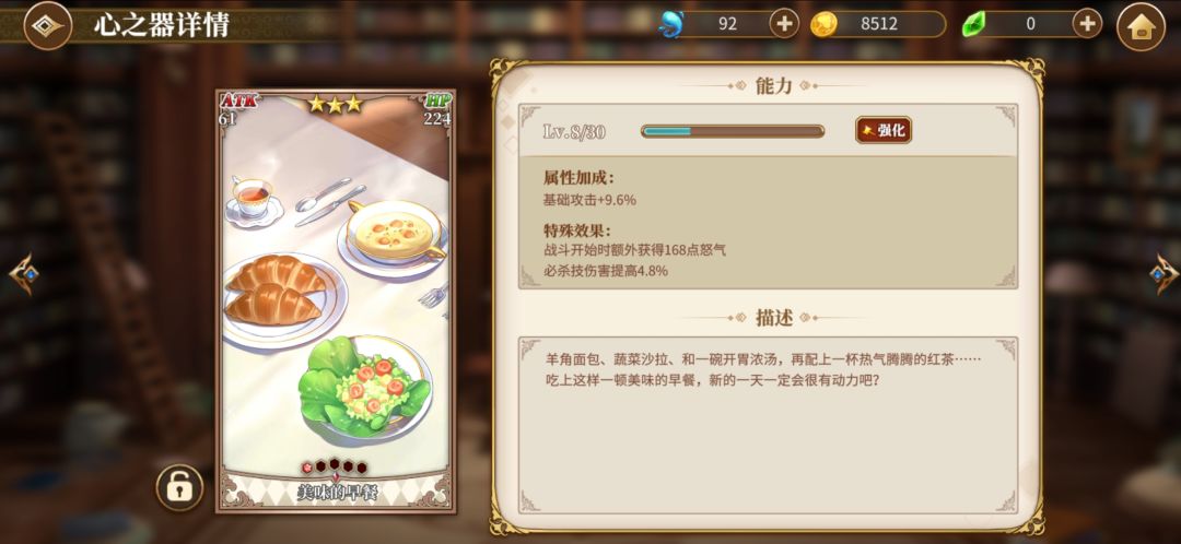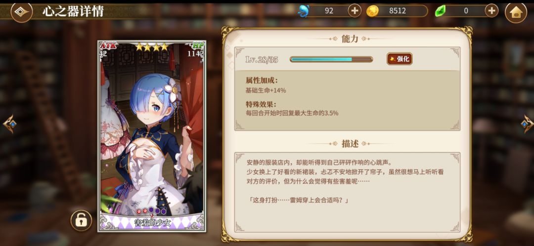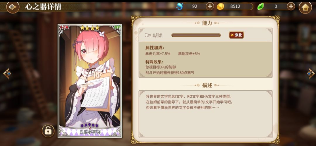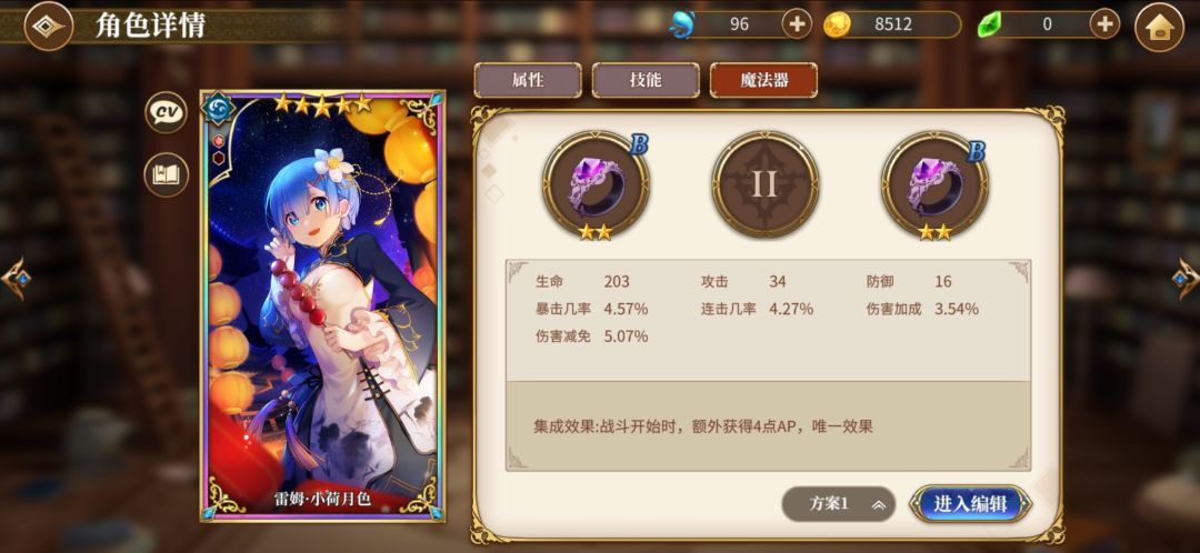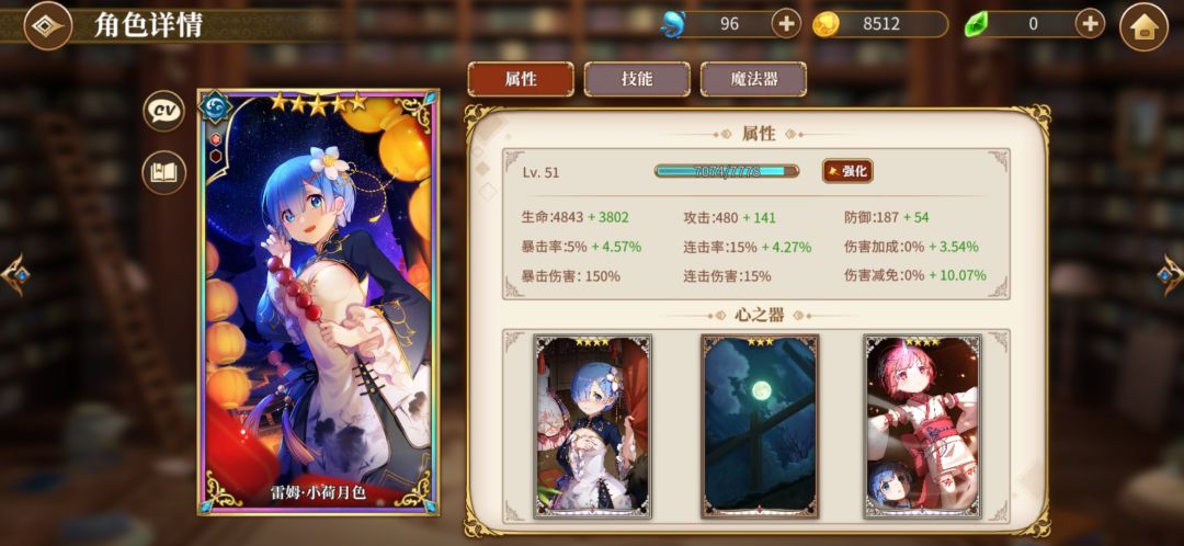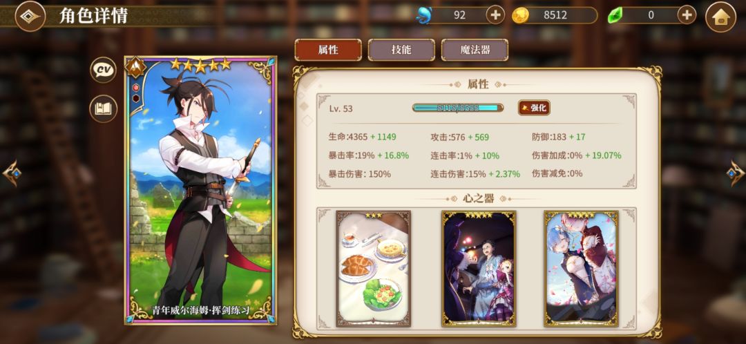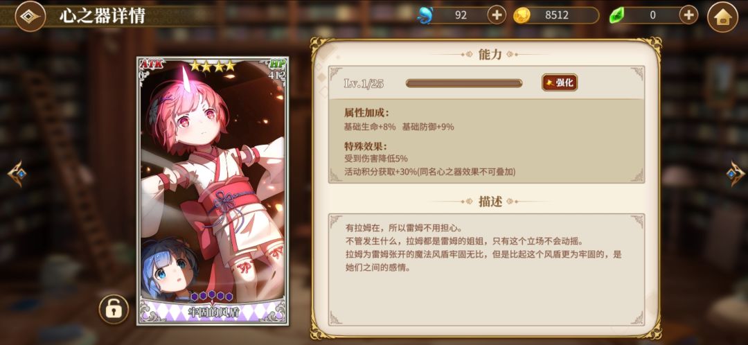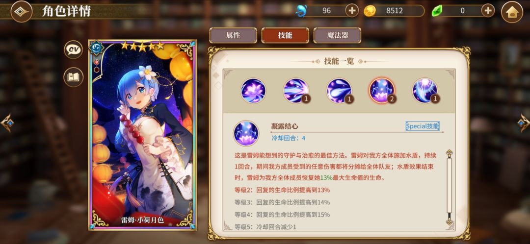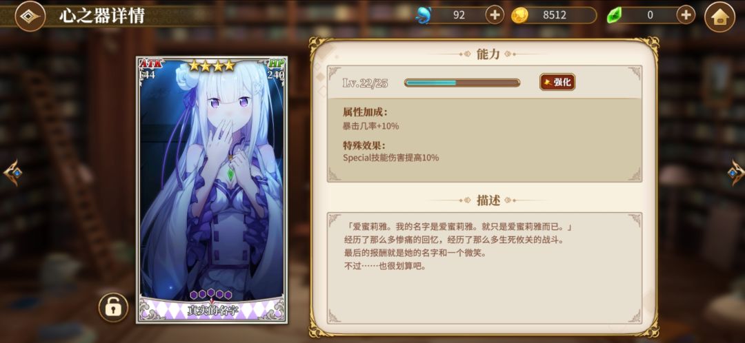 然后4星艾米莉亚,我就是用来当个辅助,毕竟有个冰冻,然后可以加加连携。艾米莉亚先升一下普通攻击技能,然后在点大招或者sp技能。然后我艾米莉亚魔法器没成套就不放图了,放个心之器的图。