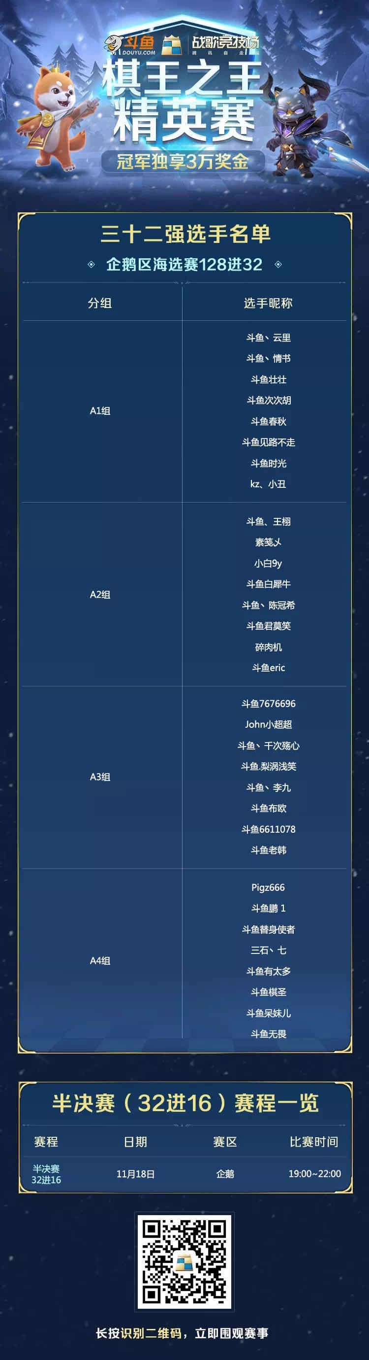 “棋王之王”精英海选赛已经结束了,各大高手间互相博弈,那场面别提有多么痛快了!现海选赛32强选手名单新鲜出炉,快来看看有没有你支持的选手吧!