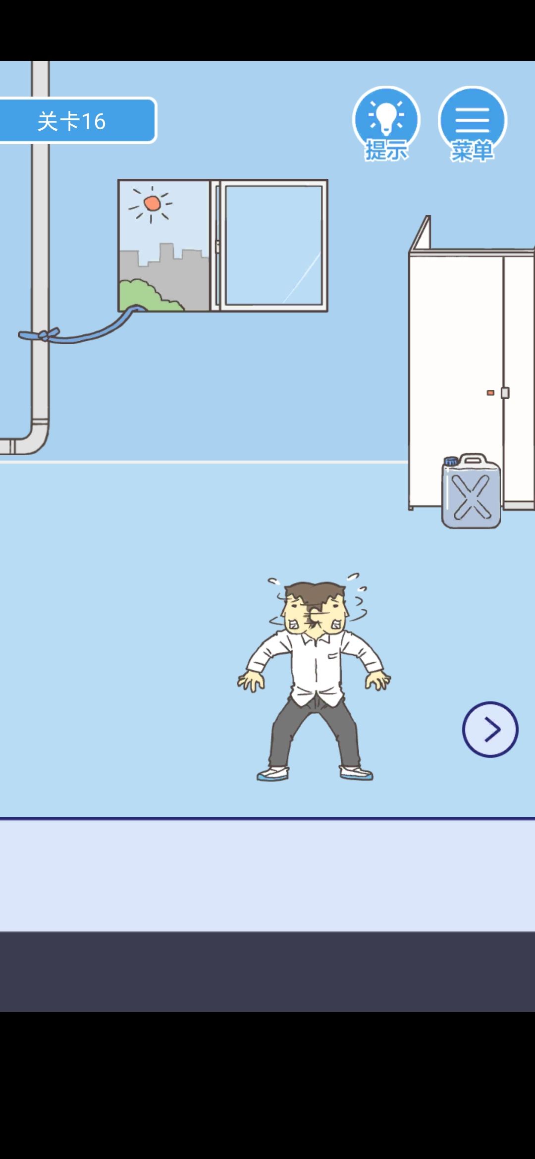 打开最右边的厕所门,得到水桶和管子,用水龙头将桶灌满水,回到左边,将桶放在第一扇门门口,打开窗户,沿着管子爬出去就行