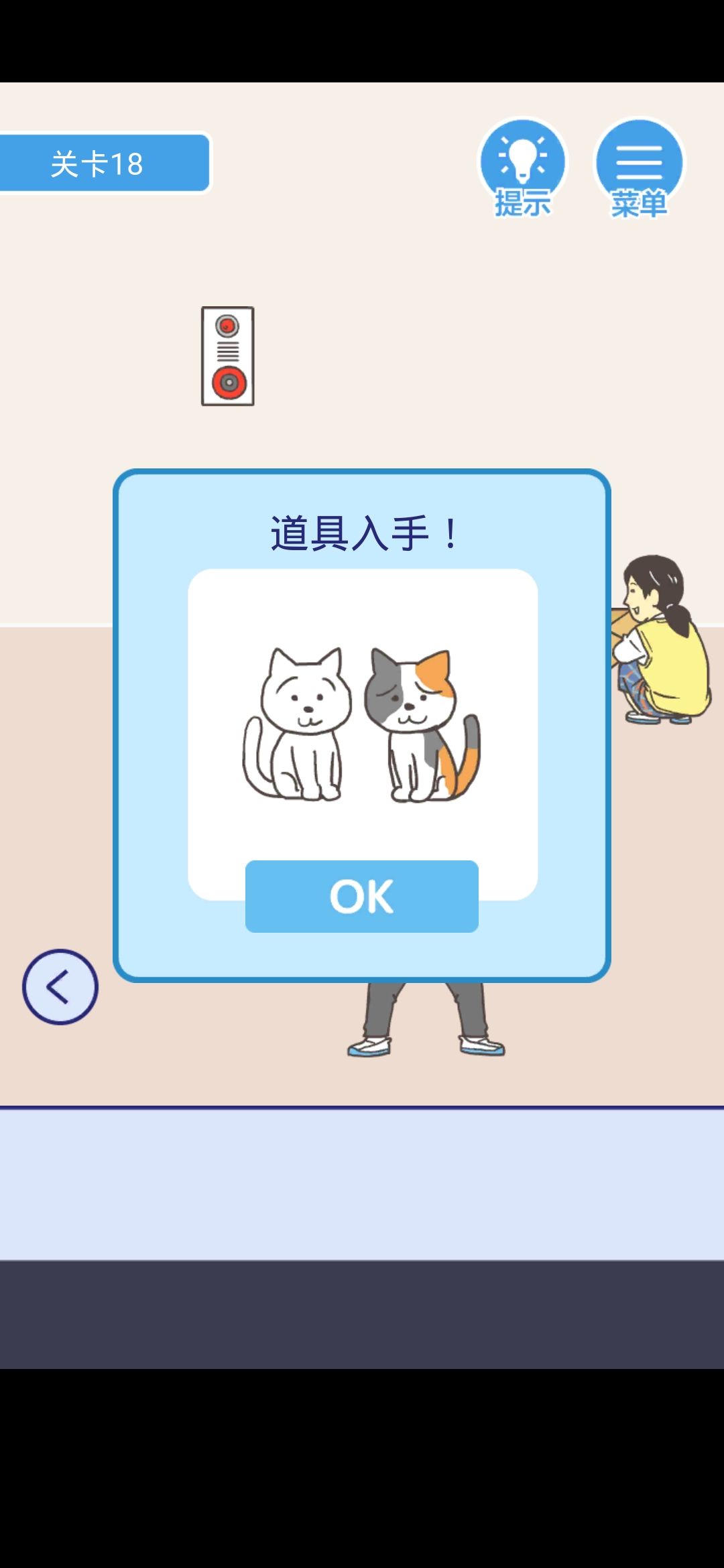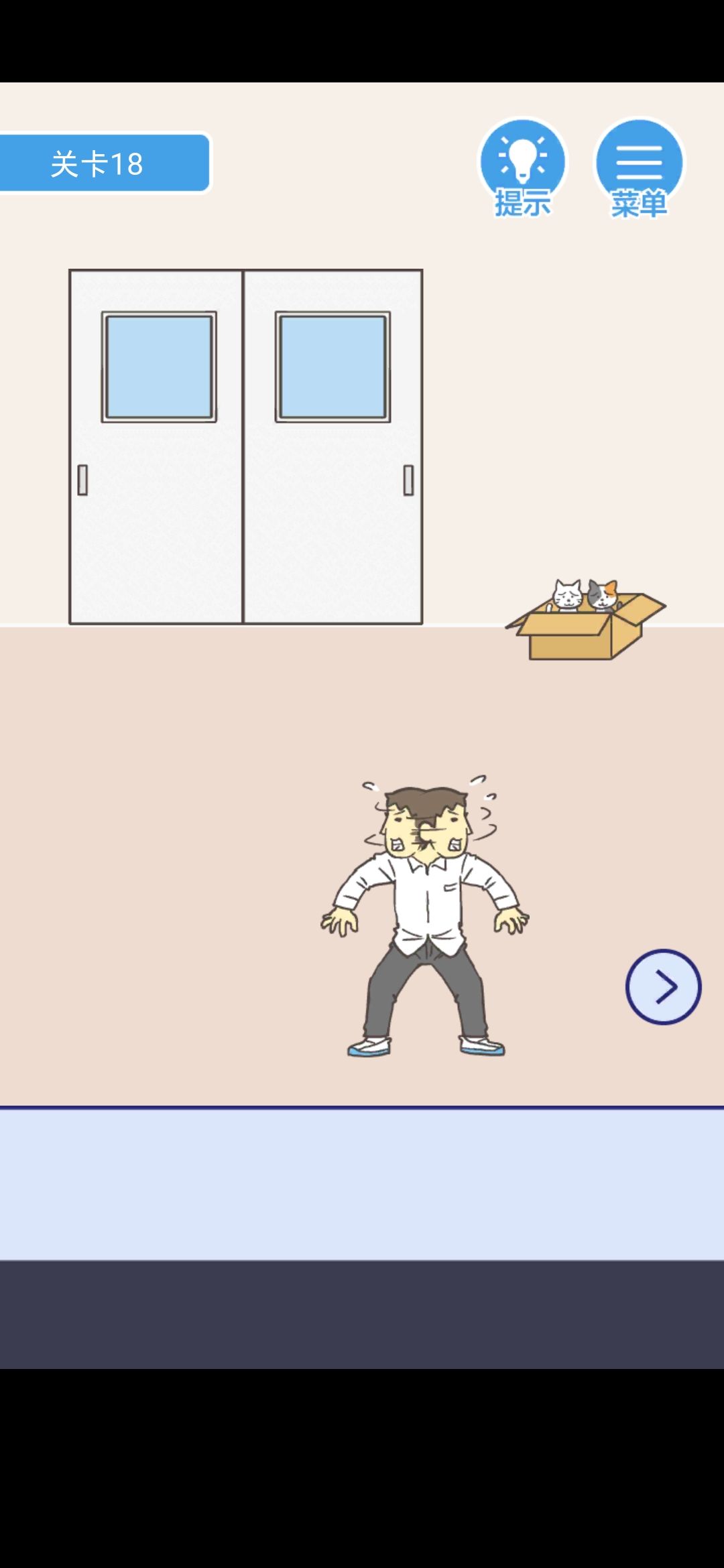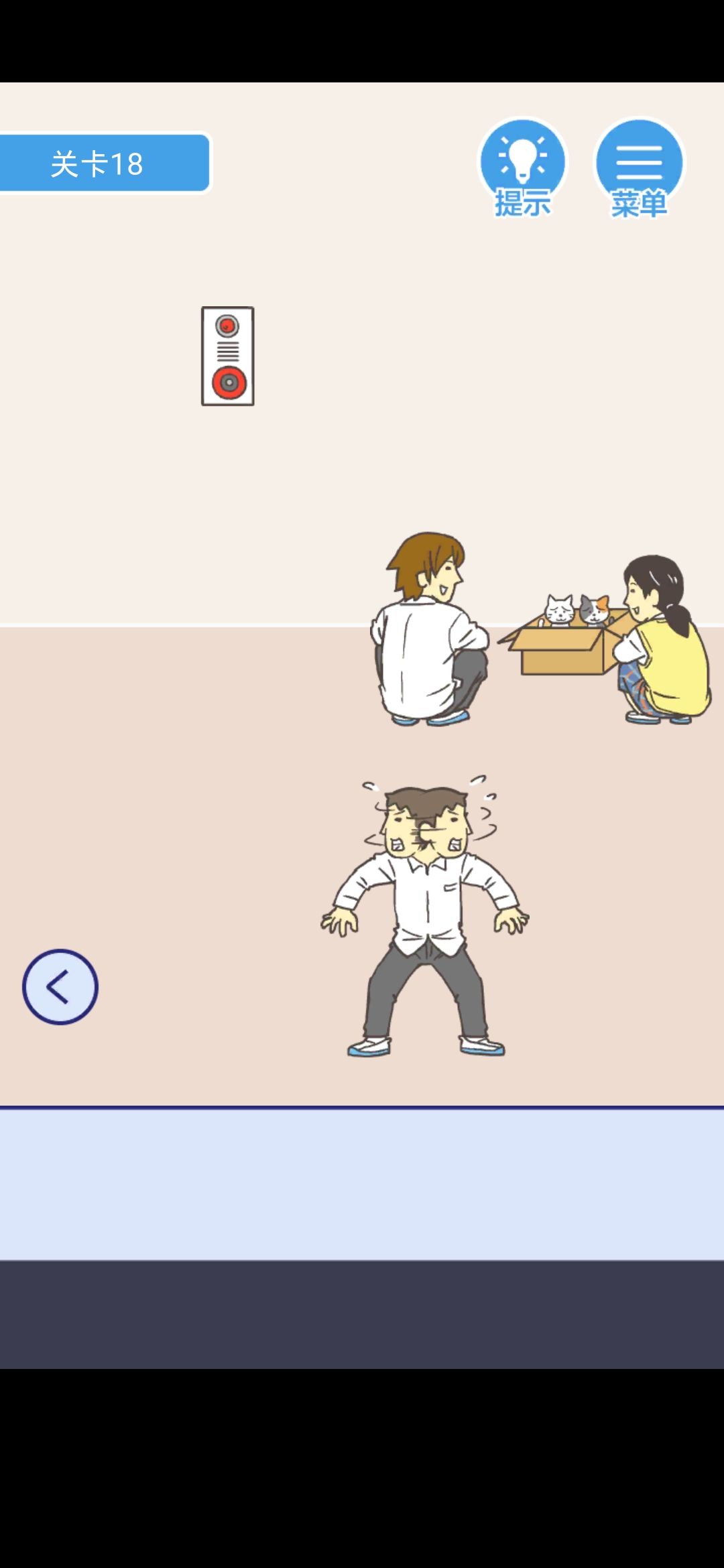 得到右边情侣看着的喵,放到左边的箱子里,按警报器,你将看到一个萌萌哒的老师,打开门逃走就行了。