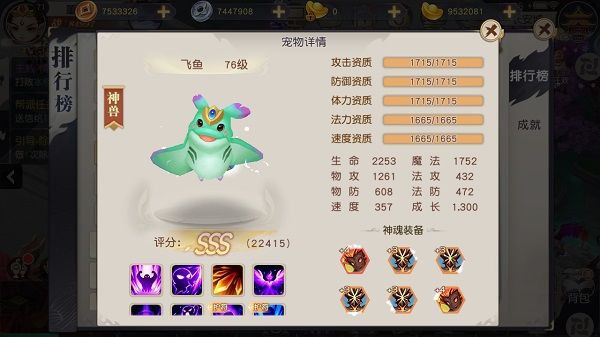 飞鱼是通过首充活动获得的稀有珍兽。明明是肥嘟嘟的体型却拥有灵活的身姿,全身被雷电与水露笼罩,一看就是个厉害角色。当然飞鱼的战力值的确对得起它的颜值,在战斗中不仅技能酷炫,伤害值也非常高,在各种副本都是一大助力呢!
