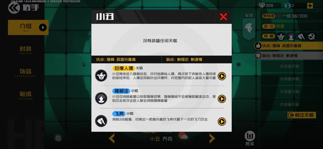 小丑释放技能会隐身在原地趴下(一定要注意,这时候你可以被攻击),之后以第三人称视角操控一个自爆人偶(时间大概6-9秒?记不太清了),人偶爆炸范围大约2个身位左右,伤害350,可以说是个大杀招。