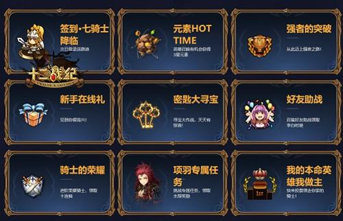 《十二战纪》官方为了迎接此次国服上线,为玩家量身定制了九大福利,帮助玩家征战亚斯特大陆。九大福利包括了签到、在线礼包、密钥、助战、本命英雄等方方面面,十分轻松简单。奖励非常丰富,包括金币、红钻、四星武器召唤券、防具召唤券以及元素选择券等等。在游戏过程中还有各种任务奖励,快速成长就是现在!