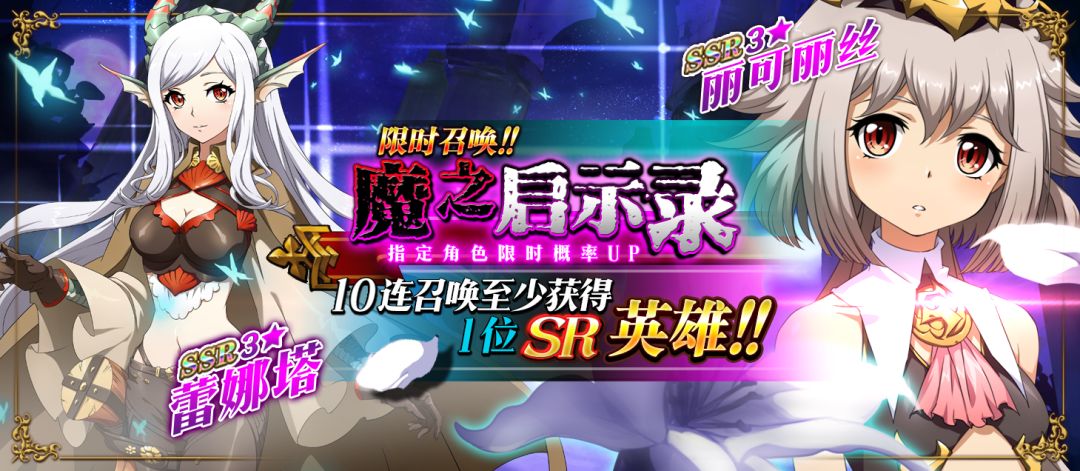 限时召唤「魔之启示录」中SSR级英雄丽可丽丝、蕾娜塔出现概率提升!