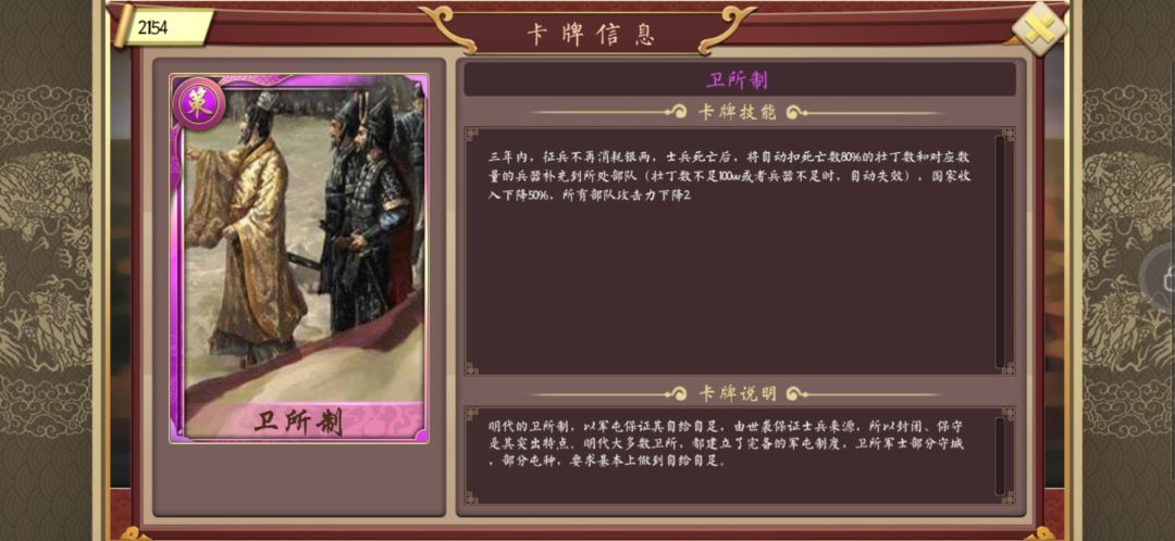 不足:每季赋税降低5%,简直是毁灭打击,前期极度不建议使用,时间太长,3年可以用很多卡了,敌意不会自然下降,降低敌意太低,用完还会加敌意。
