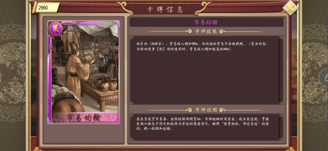 经济类的策卡,效果再紫卡里摆在前面的位子,之前我有说抄家是一桶金,而贸易就是第二桶金,加上这张卡做辅助,初始的资金基本不会枯竭。