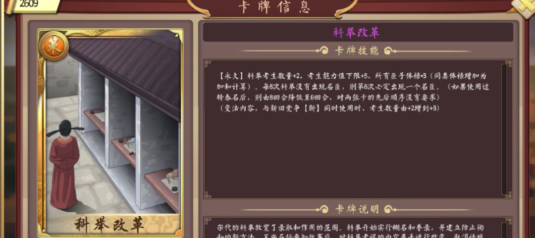 科举改革这张卡效果不强不弱,对于破局来说作用不大,但也算得上橙卡里的强卡。从出厂到如今一直保持着平衡状态,至少到如今还没有哪张卡可以k掉他。