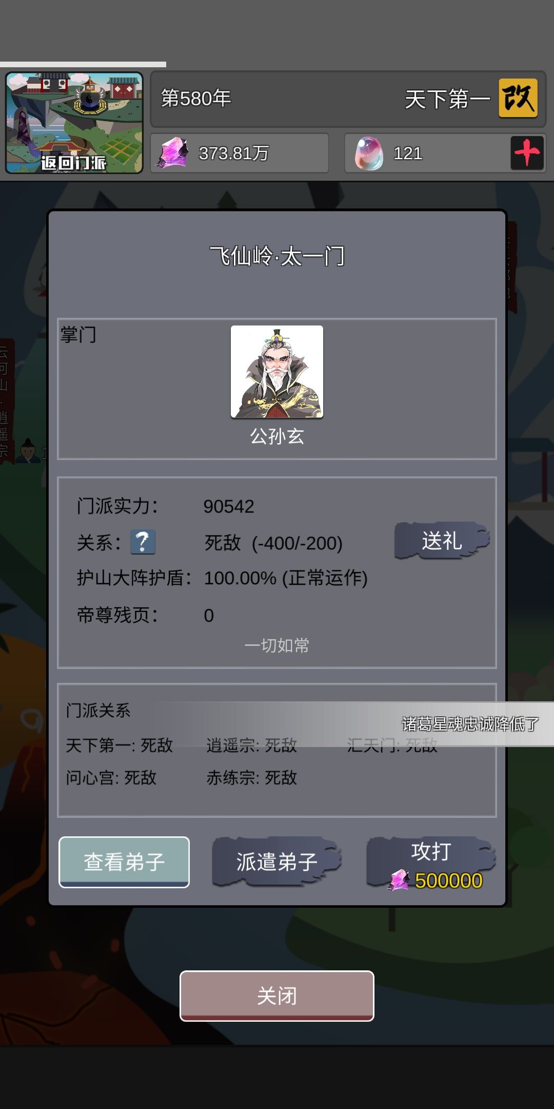 发一篇攻略 经过三天的奋战,武练时历710年大陆宗门天下第一五十名道源终于飞升仙界。 发展路线: 1,门派人员在2.0以上,2.0以下的看性格来收,三属性性格不管天赋直接收了。 2,一开始学习不老长春功(逍遥长生功),前期要平衡好,武技一攻一守,绝技学习金刚,以上需功法十二层后在开始升级,十层功法就把武技和绝技的第一层做出来。 3,科技的发展路线,互帮互助,帮助别的宗门,前期推荐不要先做生活建设,科技直到把自动挖矿做了才开始出生活建设,外事经理和传道那个后期做。 4,充钱党的整个一百块,苏颜去大汉国国师,杨开去天狼,记得收入室。 5,资源问题,大还丹一定要存住,没有虚王镜别去打宗门,灵石存起来或是多买天材地宝,云游商人的那个一品(这个一品别信他的,灵田什么等级,天材地宝就是什么等级。),纳元丹留三品到五品,谁的寿元到了用丹药砸上去。 6,鲲鹏的问题我虽然是道源老祖,但是打不过鲲鹏之母,谢广坤就没碰见。 7,道源有七八个的时候,你就可以换功法了,全部换成防御,打鲲可以横推,推到鲲鹏之母没问题。 来说说游戏的感想和建议: 1,游戏功法太少了,每个门派的功法技能大招都是一样的,感觉没啥实感,武炼巅峰里有很多开挂的功法武技才对啊,为何不搬过来。 2,普通招募弟子是不是太少了点,好歹也是个大宗门,寻缘就一个是不是有点坑。 3,为什么我灭了两个宗门,他们还存在,宗门火拼我希望能是以战养战的。 4,如果能做到,宗门弟子自己选择功法就好了,那什么先天灵体,体质啥的。 5,属性啥的是不是太简化了,没有六维属性也给个三维好吧。 6,门派弟子的个人战力看不到啊,给个评价也好啊。