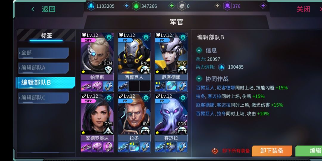 貳!紫将流!当你升到一等兵时,你这时的将领资源会大幅度增长,你的蓝色逐渐你会发现跟不上你的脚步,紫将就会成为你的主力,而其中紫将女角色可以组成一队,男角色也可以组成一队,男女角色混搭也可有一队,所以请仔细看你紫将的技能页面,找到它(她)的协同更好的组建一支帮你能征善战的强队!不会的朋友和萌新请看上图老梦已经配好可以按照老梦的出!
