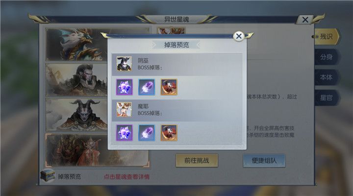 奖励内容随着异世星魂通关难度变化而升高,本体可以获得更加丰厚的数值以及物品奖励。魔耶、阴巫、仇镰和雷君四种星魂都有各自的战斗特点,根据对应星魂的战斗特点来击杀会提高我们的成功率。魔耶、阴巫、仇镰和雷君四种星魂的奖励掉落都是相似的,击杀后可以获得魂晶、灵羽以及橙色灵石等,这些都是我们提升修为会用到的关键道具,对于背饰和附灵玩法大有帮助。