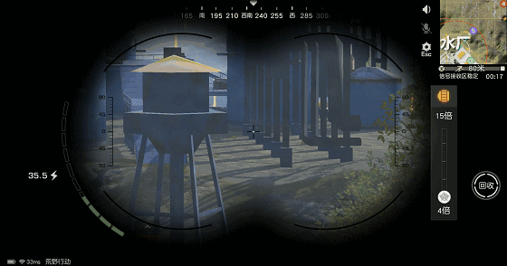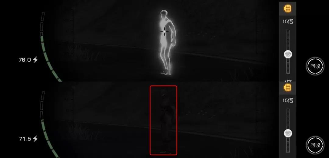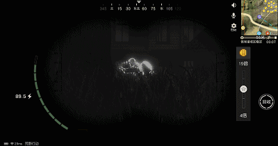 红外望远镜不仅可以在夜间使用,在白天荒友们也可以用它观察对手的位置。红外望远镜的左侧显示的是电量,右侧显示的是倍镜的放大倍数。