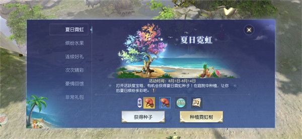 夏日霓虹活动中,天命者们只要参与日常活动玩法、开启活跃度宝箱,就有机会获得霓虹树种子!把它种在庭院中,妆点出缤纷多彩的夏日风情,还能收获万年灵芝、海量经验等丰厚好礼——霓虹树太美丽,要当心小贼光顾,一旦发现绝不用手软哦!